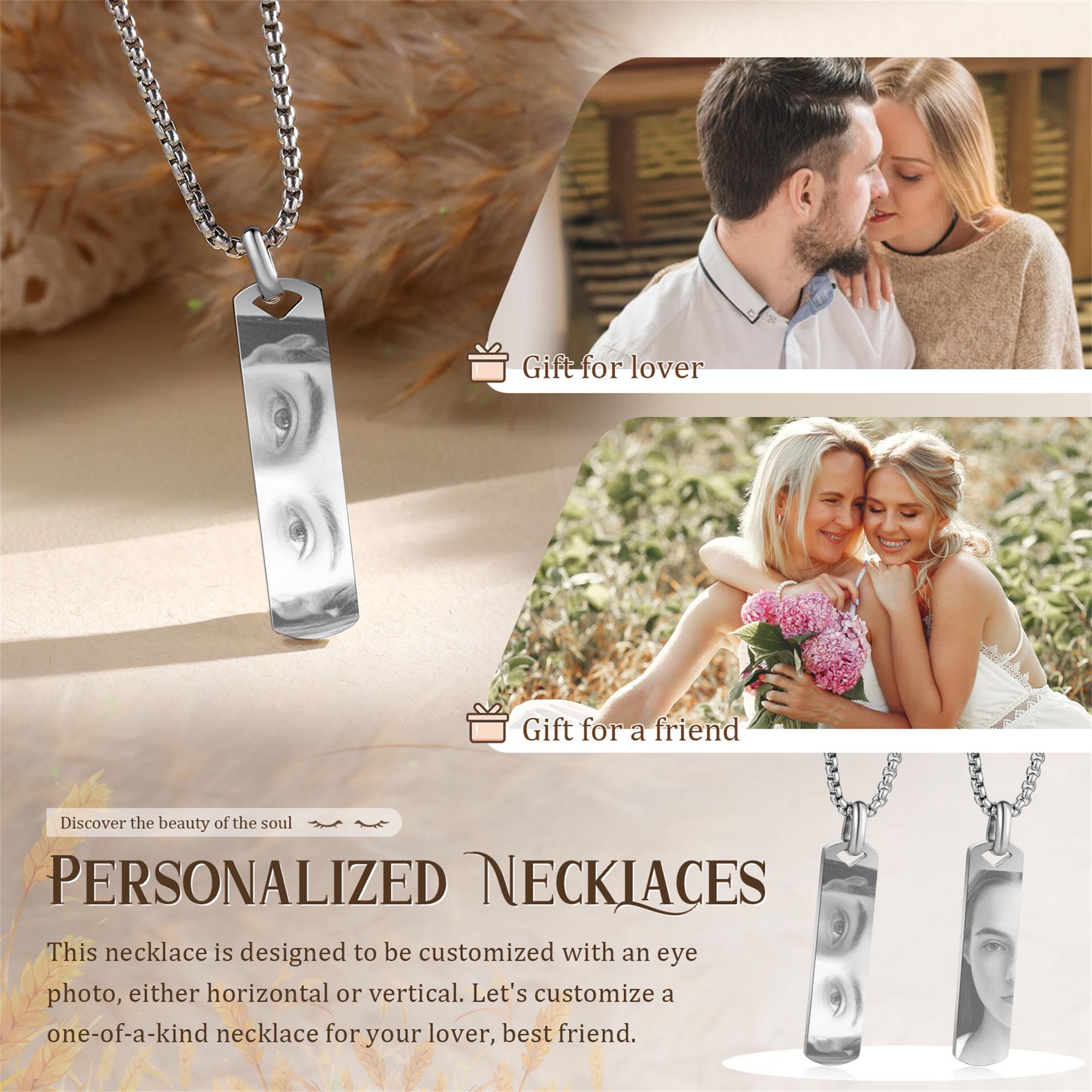 ★ This personalized eye photo necklace is a truly unique and meaningful piece of jewelry that captures a special memory in a beautiful way. With options in silver, black, and gold, you can choose the color that best suits your style and the recipient’s preferences. The centerpiece of the necklace features a detailed engraving of your own eye photo, making it an intimate and personal gift that symbolizes a deep connection with the person receiving it.